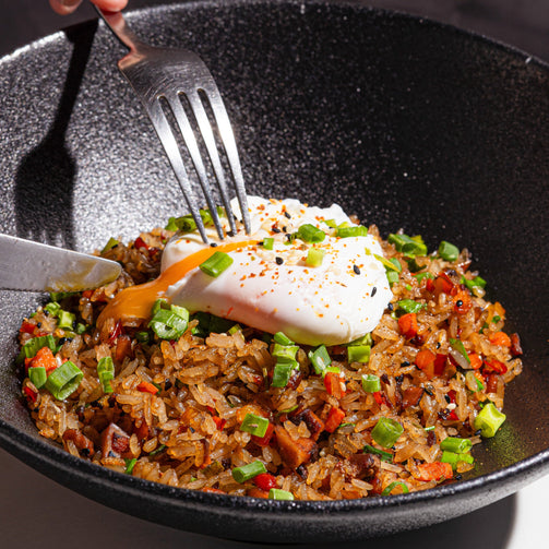 Arroz frito, pimientos morrón, hongos shiitake, huevo pochado, puerro y jengibre.