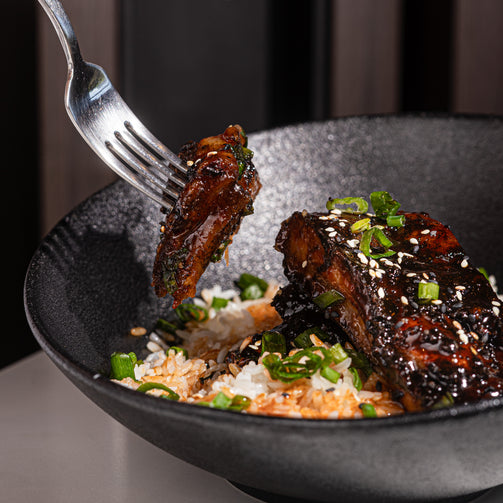 Costillitas de cerdo cocinada a fuego lento con salsa coreana sobre arroz blanco con puerro.