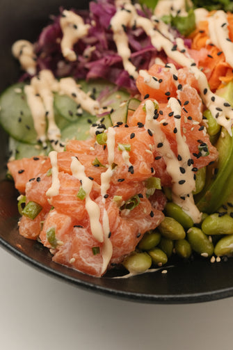 Salmon tartare, arroz, repollo, zanahoria, pepino, edamame, aguacate, jenjibre encurtido, cilantro con salsa spicy mayo.