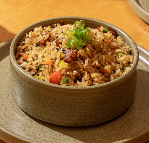 Arroz, pimientos morrones, zanahoria y plátano maduro.
